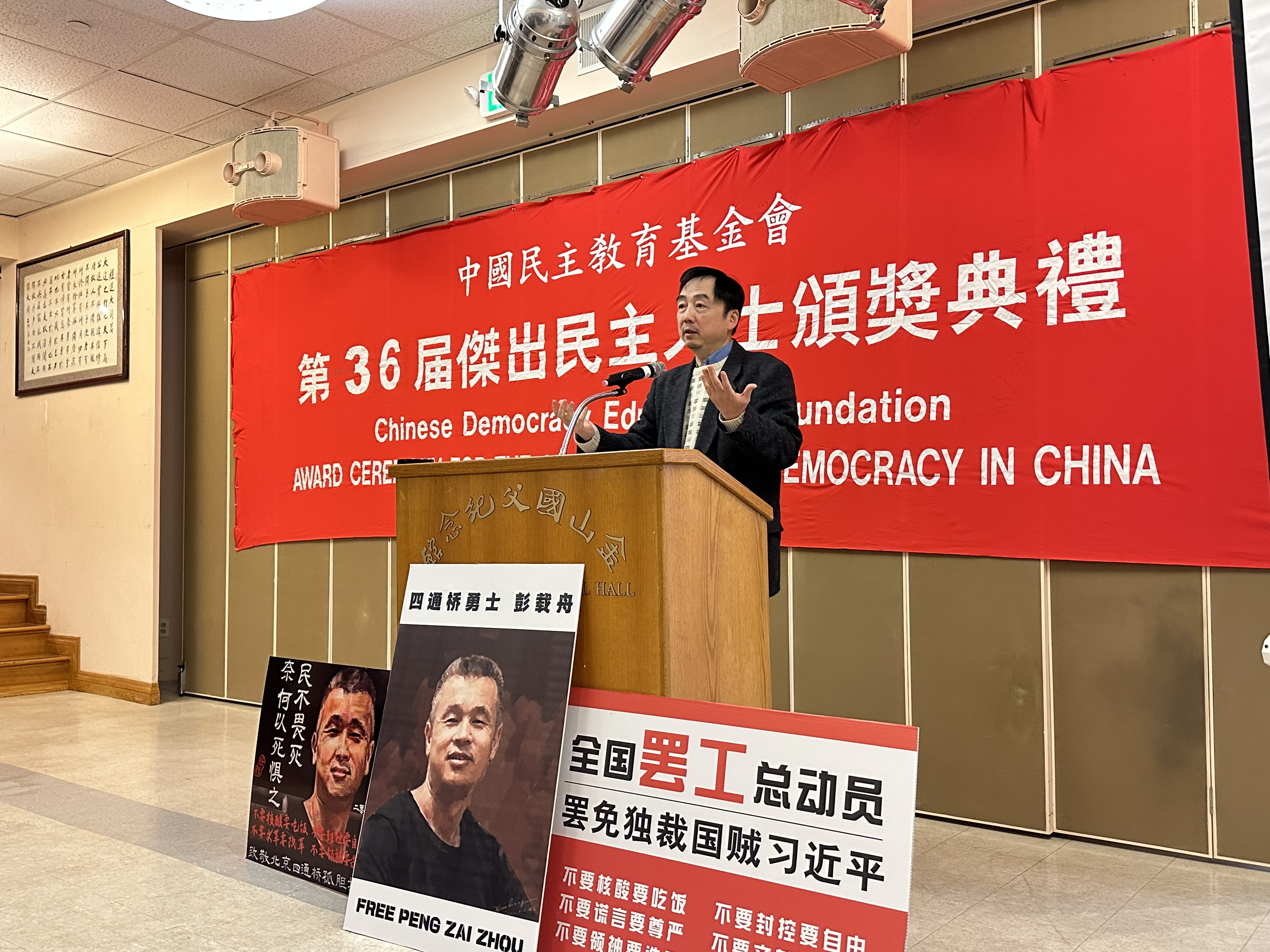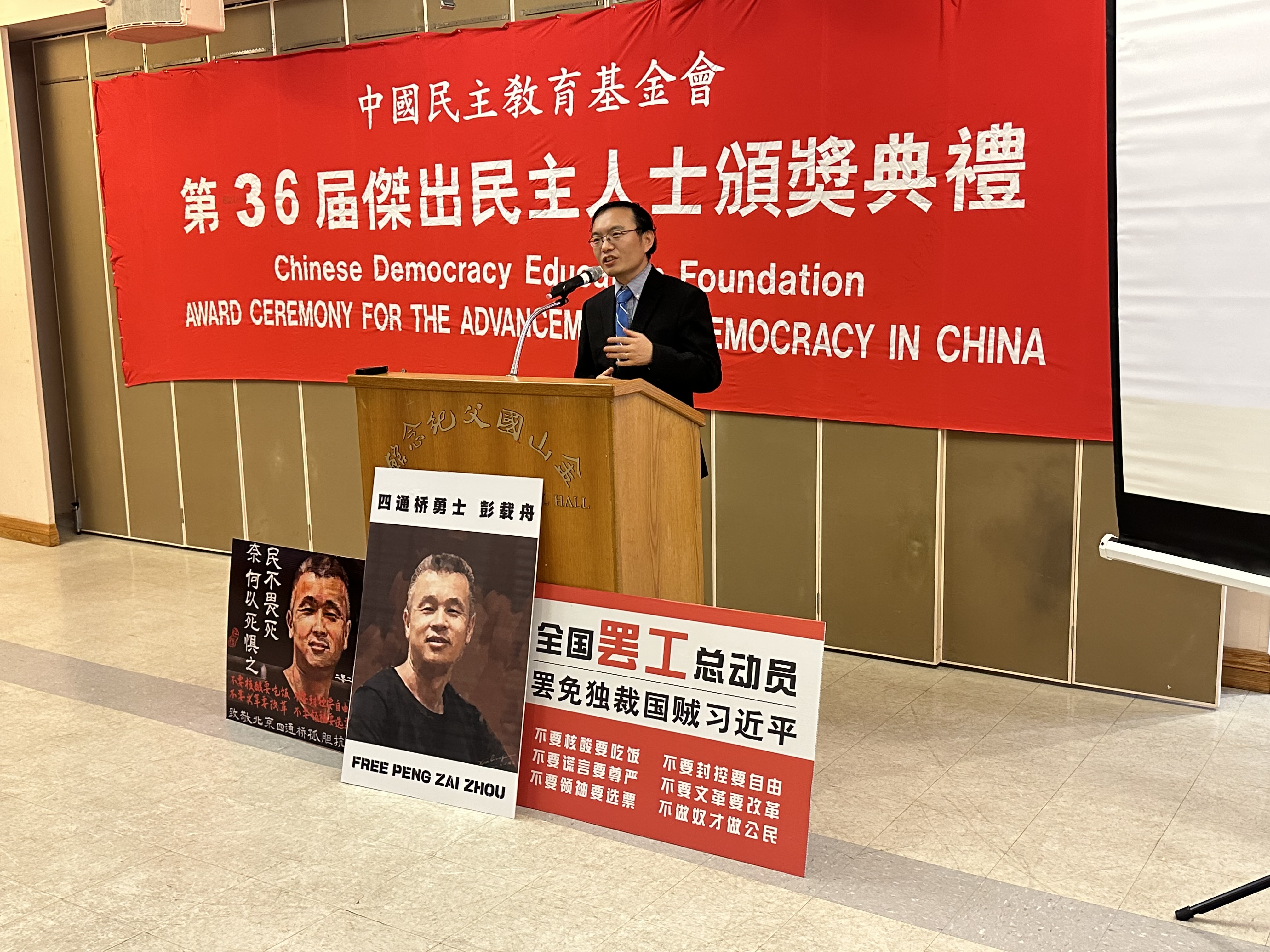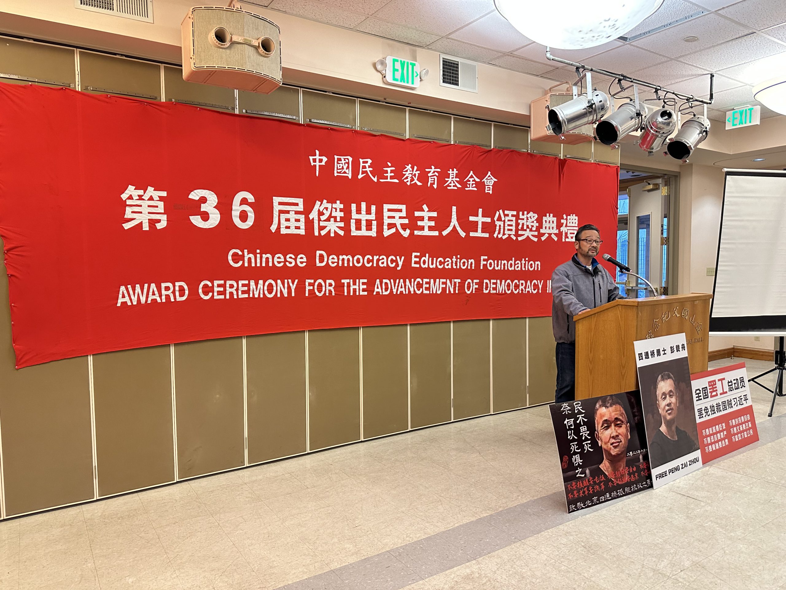 中国民主教育基金会会长方政在活动中致开场词,对从美国纽约、拉斯维加斯、洛杉矶、湾区等各个地方前来参会的人士表达了感谢,并说道:“今年,我们第36届的中国杰出民主人士奖,经过理事会和评委的慎重讨论,决定颁发给四通桥勇士彭载舟先生,表彰他的勇气。”