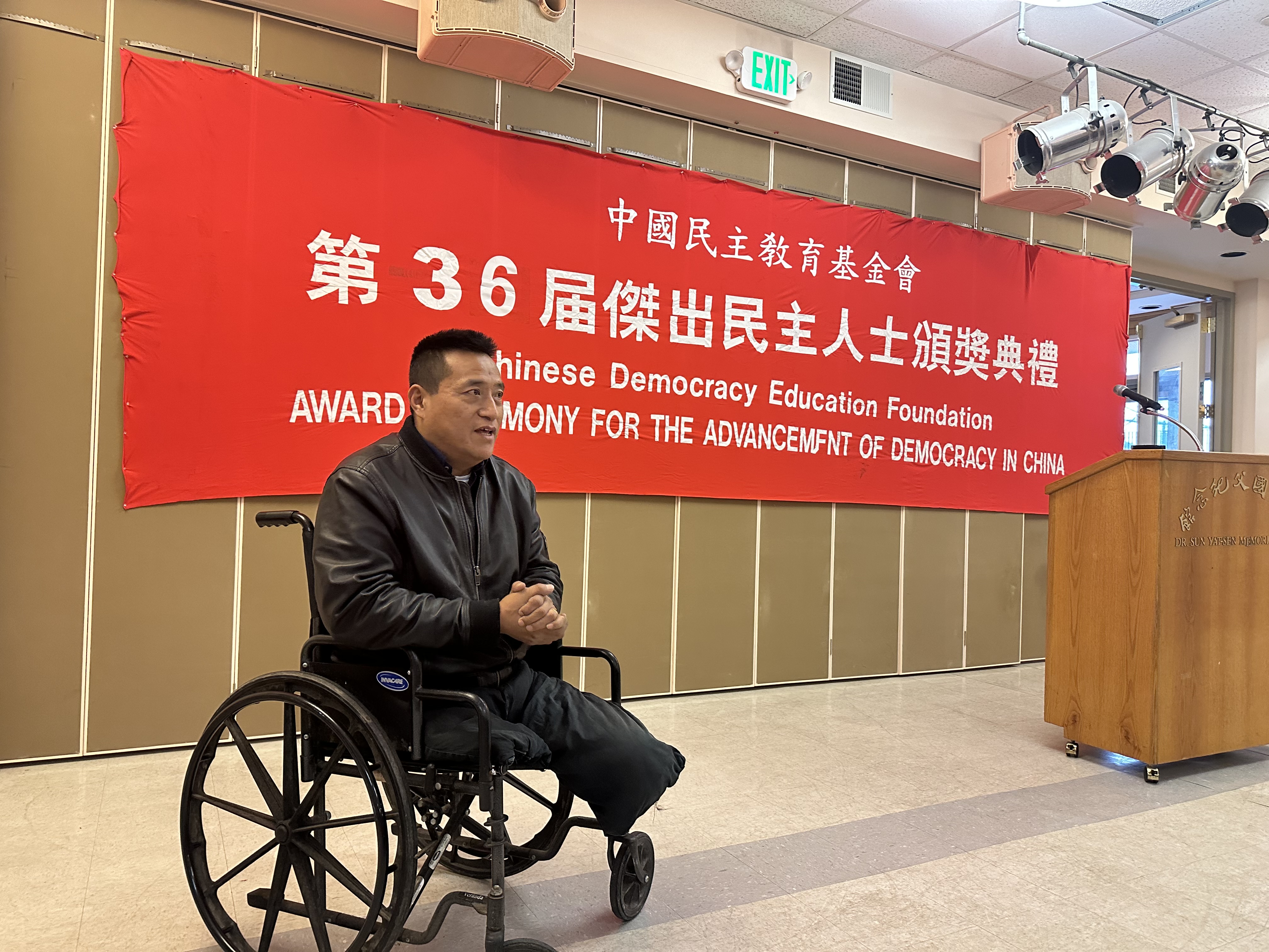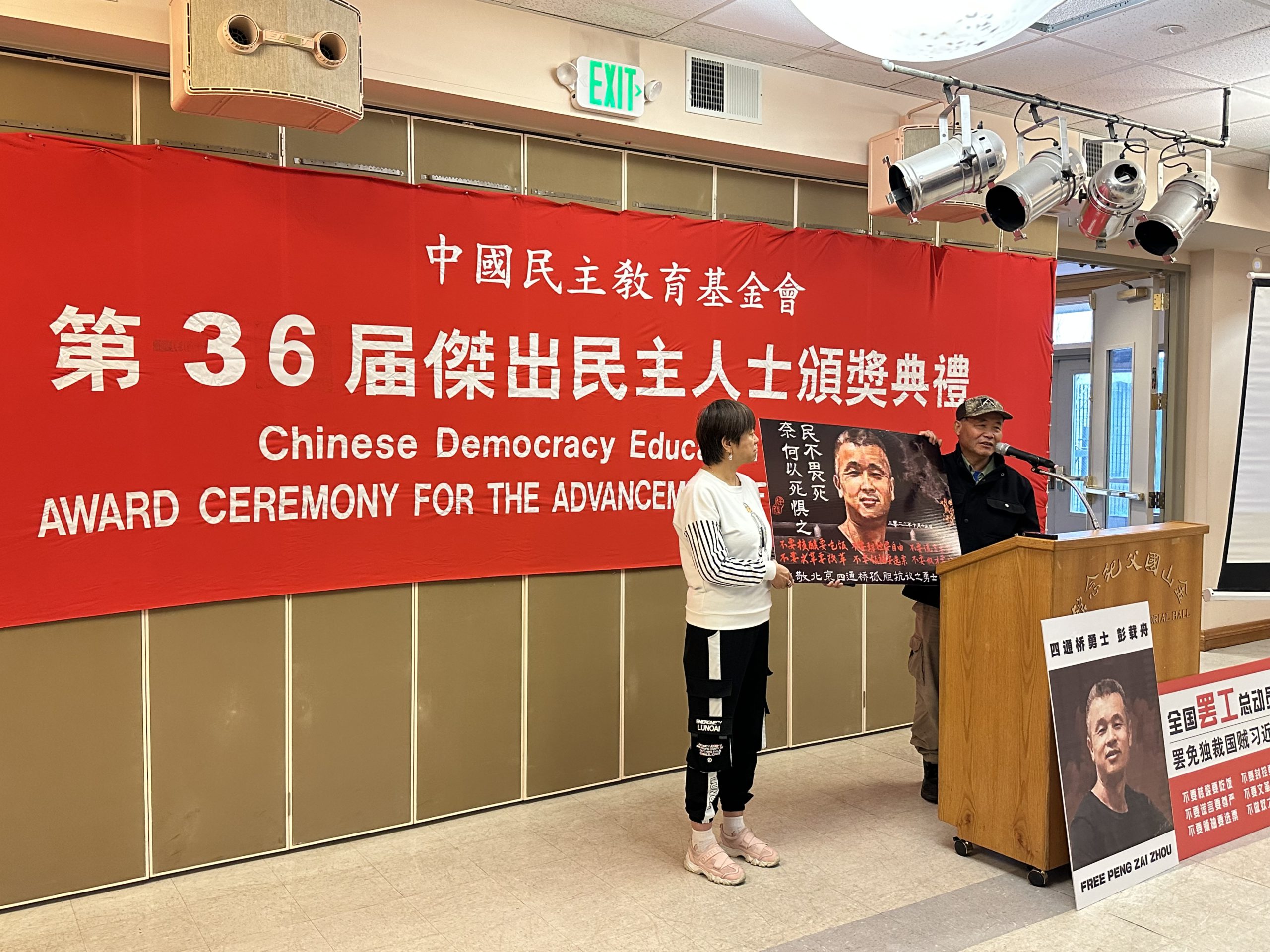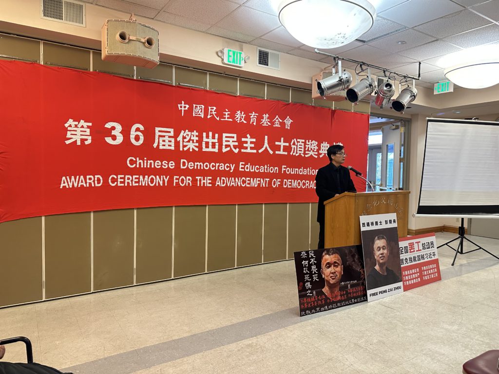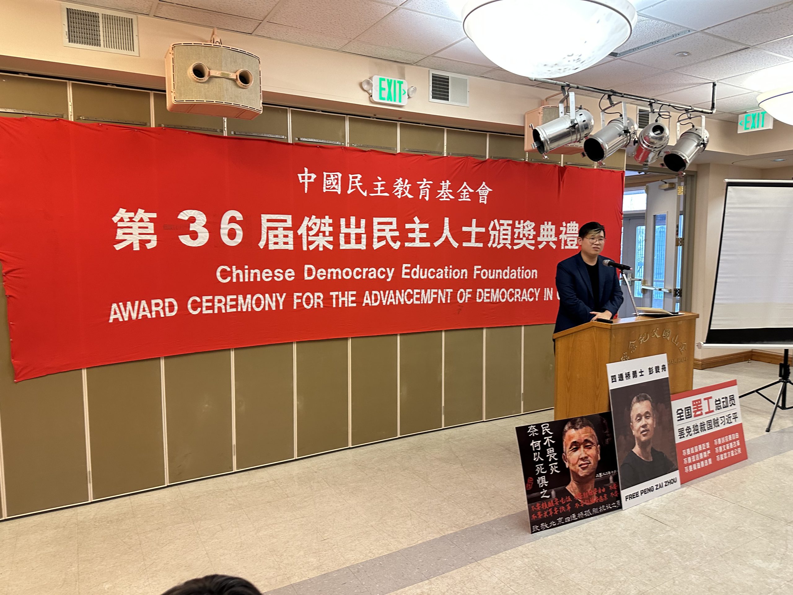 中国民主教育基金会会长方政在活动中致开场词,对从美国纽约、拉斯维加斯、洛杉矶、湾区等各个地方前来参会的人士表达了感谢,并说道:“今年,我们第36届的中国杰出民主人士奖,经过理事会和评委的慎重讨论,决定颁发给四通桥勇士彭载舟先生,表彰他的勇气。”