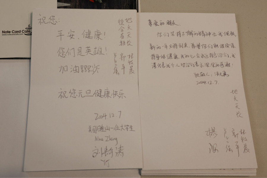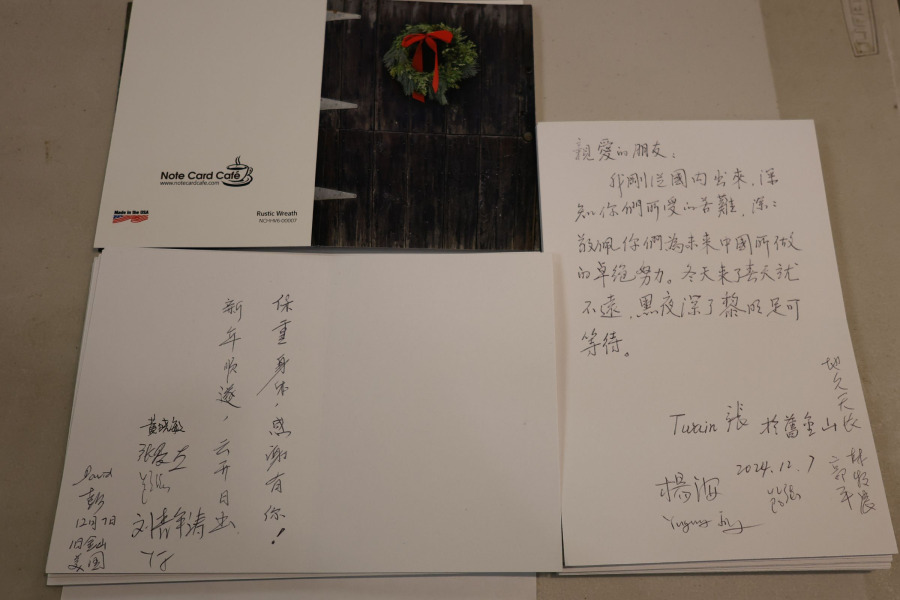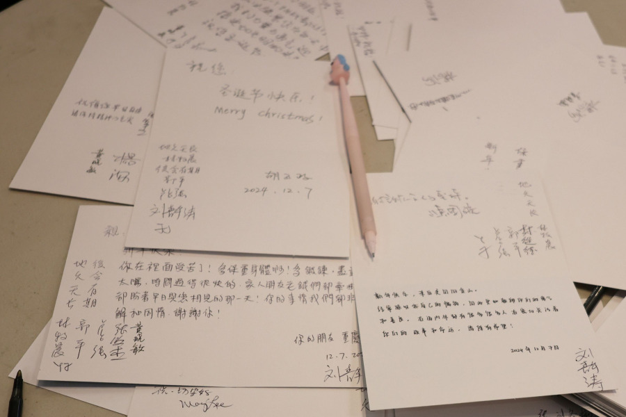 中國民主黨舊金山黨部負責人黃曉敏在白紙和賀卡上撰寫中、英文祝福語,慰問香港和中國大陸的政治犯。