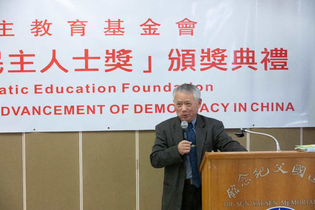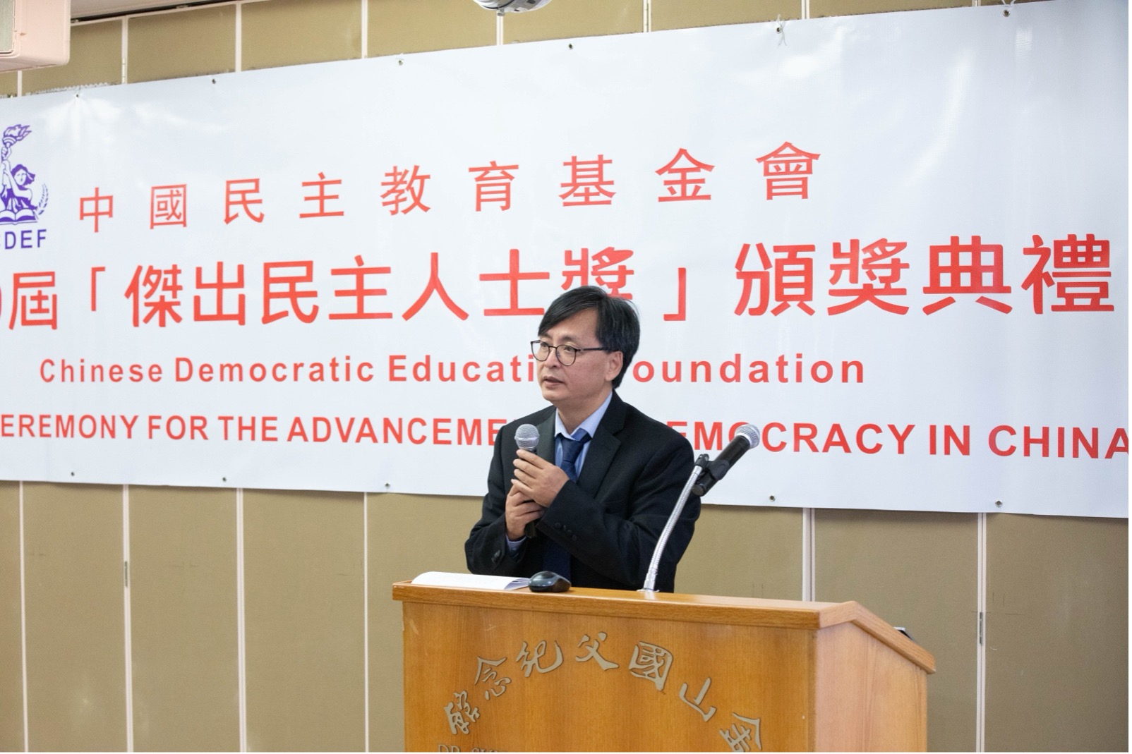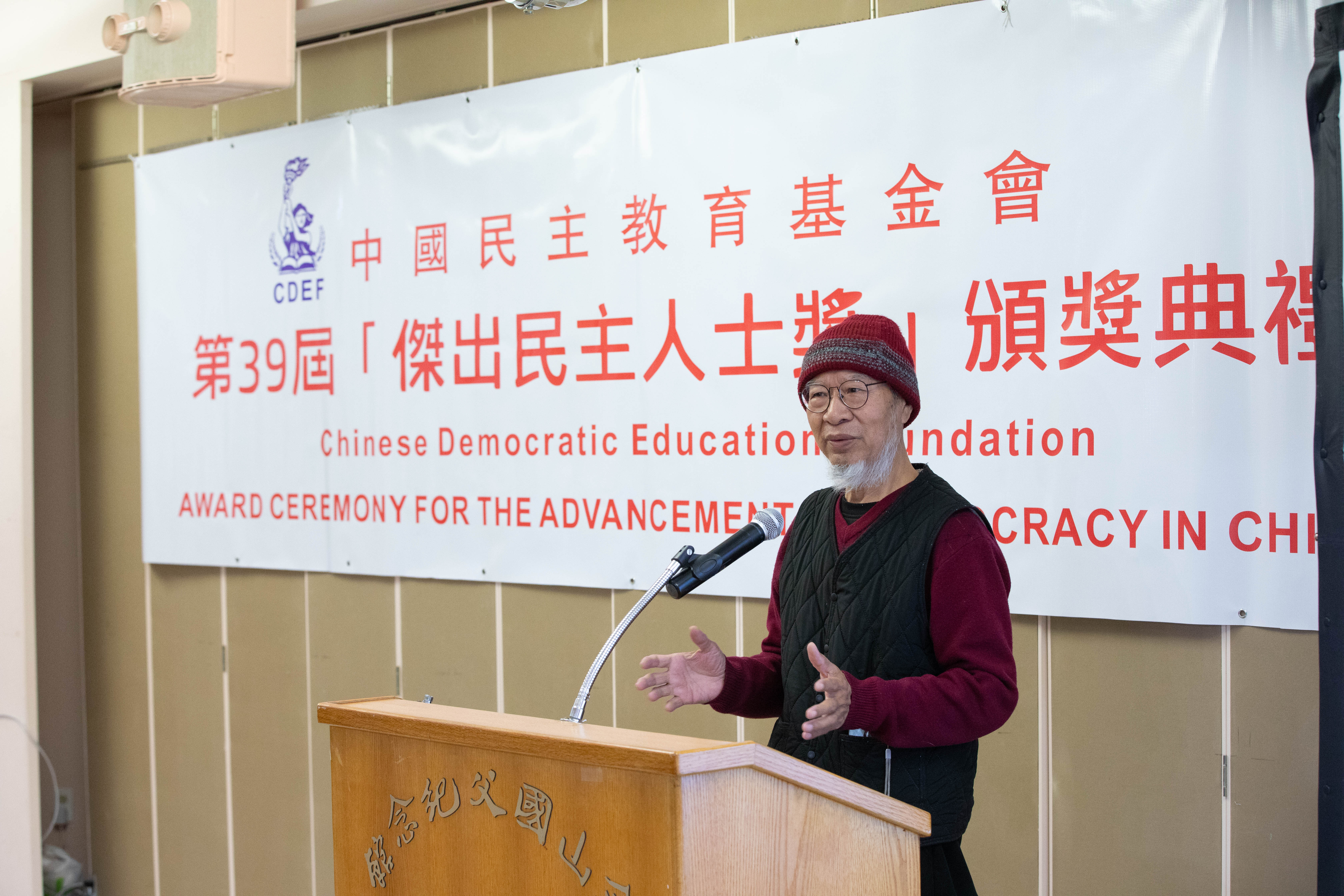 明居正教授通过电话连线的形式向大会现场发表了演讲,向中国民主教育基金会向他颁发的第三十九届「杰出民主人士奖」奖表示感谢。