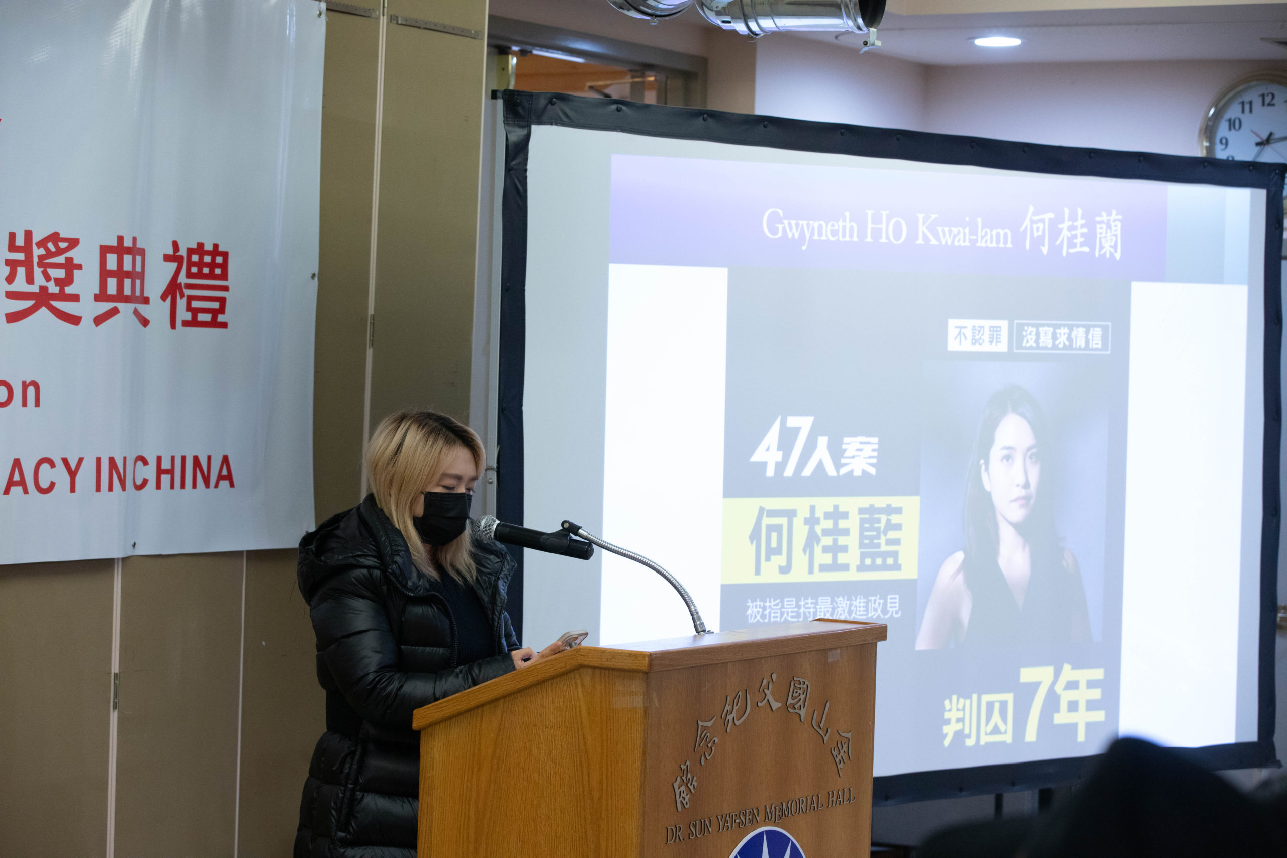 获奖者《立场新闻》记者何桂蓝女士(香港民主运动参与者阿丝代为领奖)